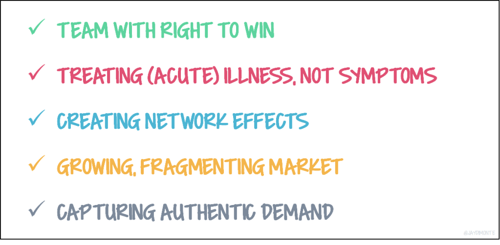 - Market: The most interesting markets are growing and fragmented (or large and ready for disruption). I am looking for $B+ market sizes. Ideally the company creates an expanding market. If they are starting niche and growing, I look for expansion driven by:
